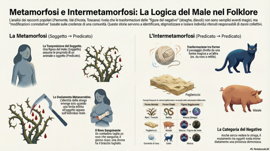 Questo studio analizza i fenomeni di metamorfosi e intermetamorfosi all’interno dei racconti popolari dell’Italia settentrionale, adottando una prospettiva semiotica. Gli autori interpretano la trasformazione magica non come un cambio ontologico, ma come la proiezione di un soggetto malefico, come la strega, in un suo predicato figurativo, quale un animale o un oggetto. Mentre la metamorfosi semplice viene spesso svelata solo attraverso un commento metanarrativo che identifica il colpevole, l’intermetamorfosi manifesta la natura sovrannaturale già nel passaggio diretto tra due forme diverse. Tale processo si basa su una cornice intensionale di credenze condivise dalla comunità, che attribuisce connotazioni negative a individui marginalizzati. In definitiva, la ricerca dimostra come il linguaggio del folklore strutturi l’immaginario collettivo attraverso complesse relazioni tra identità e figurazione.